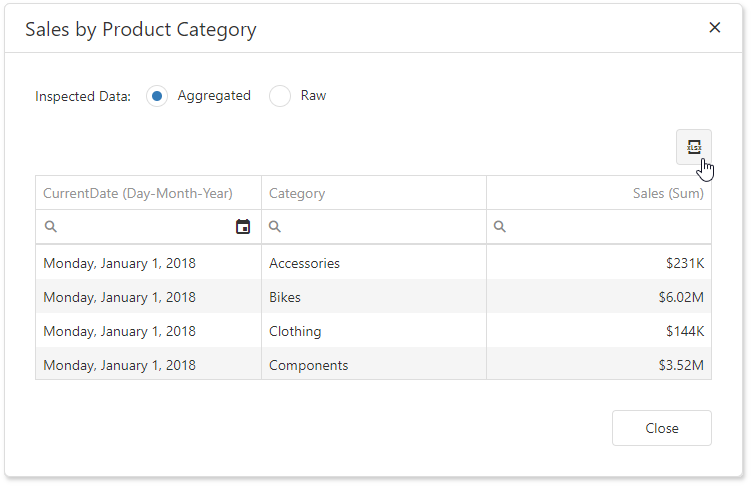 When both properties are true, each dashboard item caption contains the “Inspect Data” button. Click the button to invoke the Data Inspector window that contains two grids with raw and aggregated data. The window caption displays the dashboard item caption text.