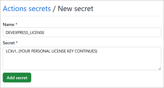 Use secret values in your GitHub Actions CLI scripts (YAML). Assign the license key to the environment variable named DevExpress_License. Use the NuGet API Key when you register the package source. Note that GitHub Actions can only read a secret if you explicitly include the secret in a workflow. Enclose the secret’s name within the quoting rules when you pass a secret in the command line. This is required to avoid special characters that may affect your shell.