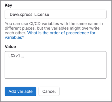 DevExpress license information must be available during the build stage so it can be injected into binary artifacts. To make that information available in CI/CD environments, store your license key in a text file or an environment variable named DevExpress_License. Examples below demonstrate how you can do this.