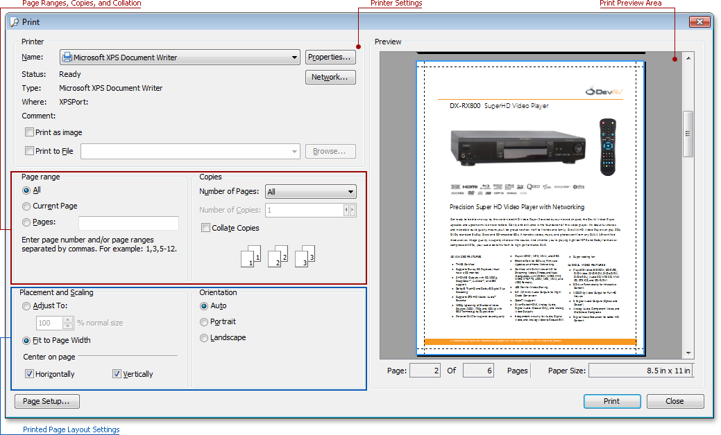 The PDF Viewer uses a custom Print dialog that includes the print preview area and printed page layout settings (usually available on the Page and Scaling tabs of the Page Setup dialog) in addition to the functionality provided by the standard Print dialog used by other DevExpress VCL controls: