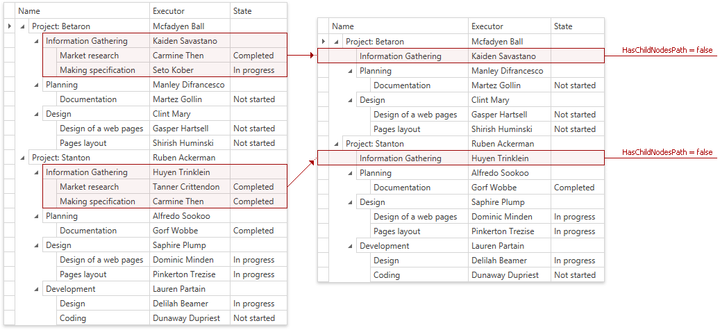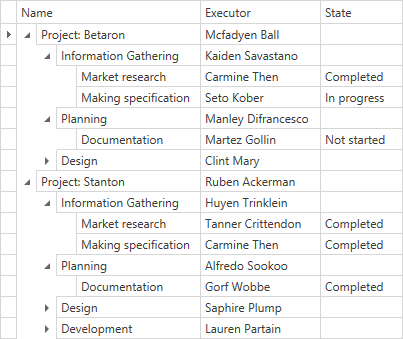 public class BaseObject { public string Name { get; set; } public string Executor { get; set; } public ObservableCollection<Task> Tasks { get; set; } public bool HasChildNodes { get; set; } } public class ProjectObject : BaseObject { } public class Task : BaseObject { public string State { get; set; } } public class ViewModel { ObservableCollection<ProjectObject> InitData() { ObservableCollection<ProjectObject> projects = new ObservableCollection<ProjectObject>(); ProjectObject betaronProject = new ProjectObject() { Name = "Project: Betaron", Executor = "Mcfadyen Ball", Tasks = new ObservableCollection<Task>(), HasChildNodes = true }; Task Task11 = new Task() { Name = "Information Gathering", Executor = "Kaiden Savastano", Tasks = new ObservableCollection<Task>(), HasChildNodes = false }; Task11.Tasks.Add(new Task() { Name = "Market research", Executor = "Carmine Then", State = "Completed", HasChildNodes = false }); Task11.Tasks.Add(new Task() { Name = "Making specification", Executor = "Seto Kober", State = "In progress", HasChildNodes = false }); Task Task12 = new Task() { Name = "Planning", Executor = "Manley Difrancesco", Tasks = new ObservableCollection<Task>(), HasChildNodes = true }; Task12.Tasks.Add(new Task() { Name = "Documentation", Executor = "Martez Gollin", State = "Not started", HasChildNodes = true }); // ... ProjectObject stantoneProject = new ProjectObject() { Name = "Project: Stanton", Executor = "Ruben Ackerman", Tasks = new ObservableCollection<Task>(), HasChildNodes = true }; Task Task21 = new Task() { Name = "Information Gathering", Executor = "Huyen Trinklein", Tasks = new ObservableCollection<Task>(), HasChildNodes = false }; Task21.Tasks.Add(new Task() { Name = "Market research", Executor = "Tanner Crittendon", State = "Completed", HasChildNodes = false }); Task21.Tasks.Add(new Task() { Name = "Making specification", Executor = "Carmine Then", State = "Completed", HasChildNodes = false }); Task Task22 = new Task() { Name = "Planning", Executor = "Alfredo Sookoo", Tasks = new ObservableCollection<Task>(), HasChildNodes = true }; Task22.Tasks.Add(new Task() { Name = "Documentation", Executor = "Gorf Wobbe", State = "Completed", HasChildNodes = true }); // ... } }Set the TreeListView.HasChildNodesPath property to this field’s name.