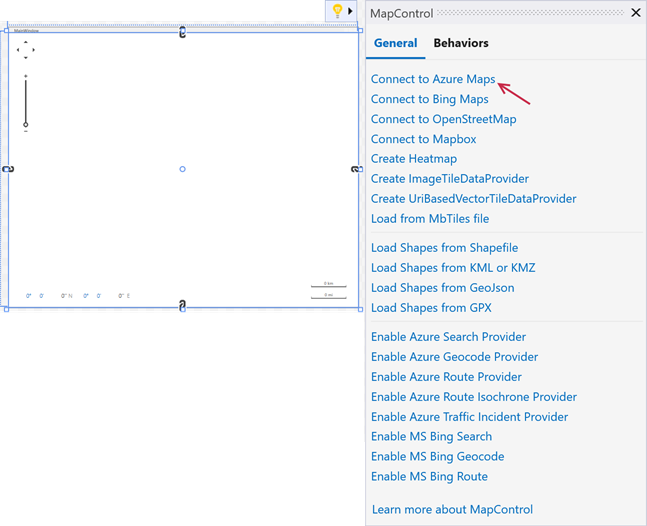 Invoke the Map Control’s smart tag menu or Quick Actions and select the Connect to Azure Maps action.