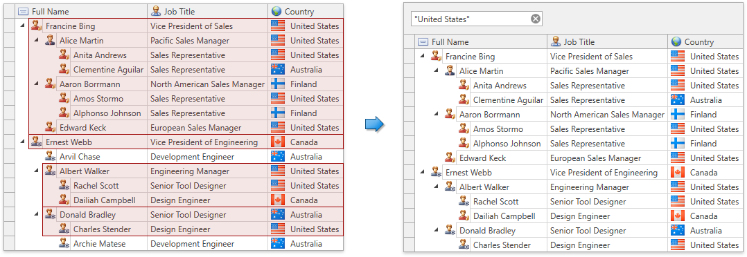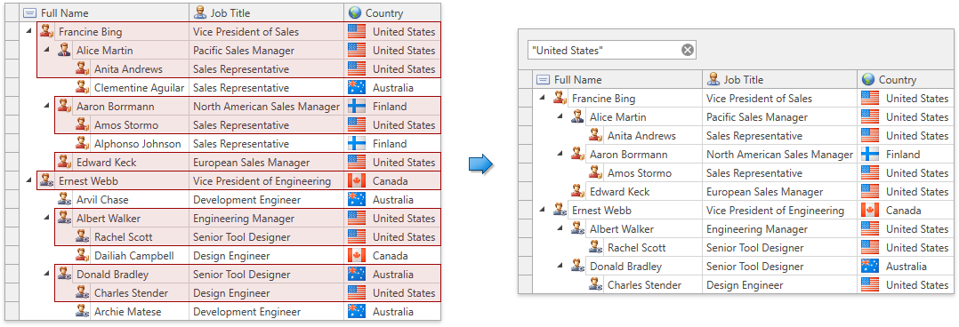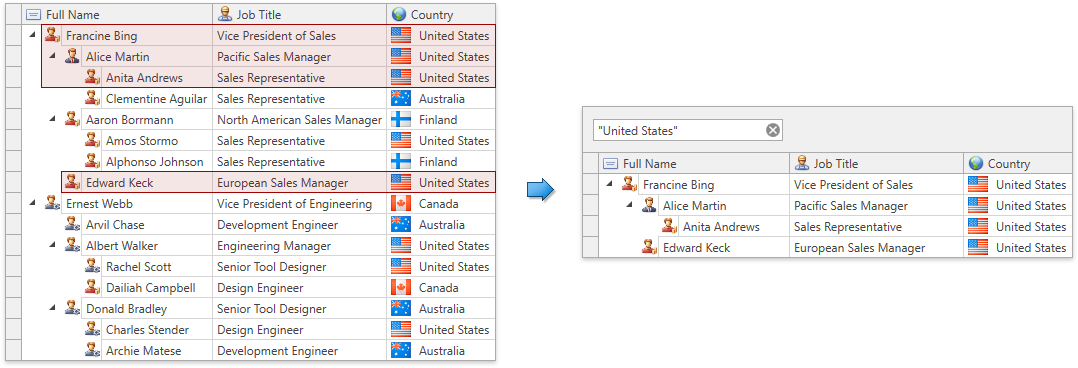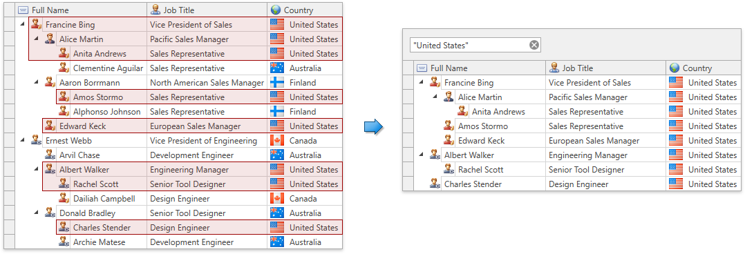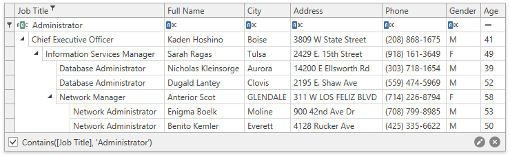 The TreeListView displays only nodes that meet the filter criteria. A node at the hierarchy’s highest level that meets the filter criteria becomes the root node. The node’s nearest child that meets the filter criteria changes the hierarchy level to the next level down from the root.