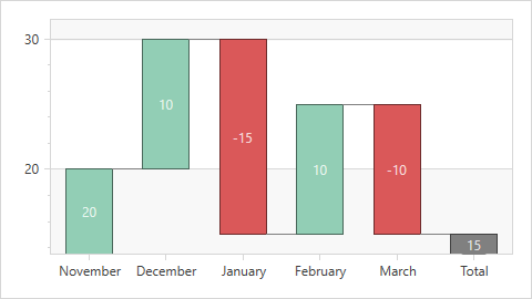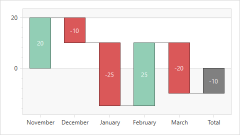 If the WaterfallSeries2D.ValueOptions property is set to a WaterfallRelativeValueOptions object, the control processes data source values as increments/decrements. You can create and assign a WaterfallAbsoluteValueOptions object to handle data as absolute values.
