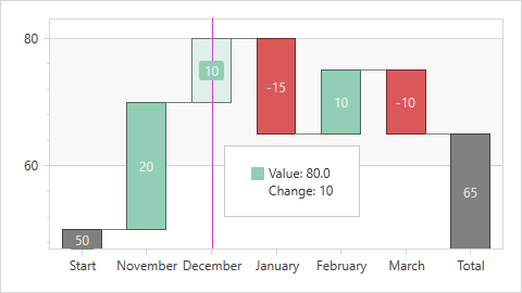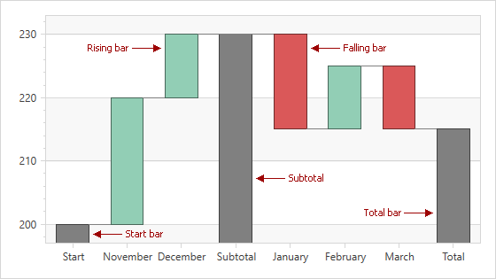 Set the WaterfallSeries2D.ValueOptions property to a WaterfallRelativeValueOptions object if the chart’s data source stores increments/decrements. You can also display a start bar with the initial value. The chart plots a start bar at zero if the start bar value is not specified.