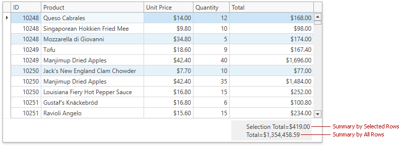 DisplayFormat="Grand Total=${0:N}" CalculationMode="SelectedRows" />