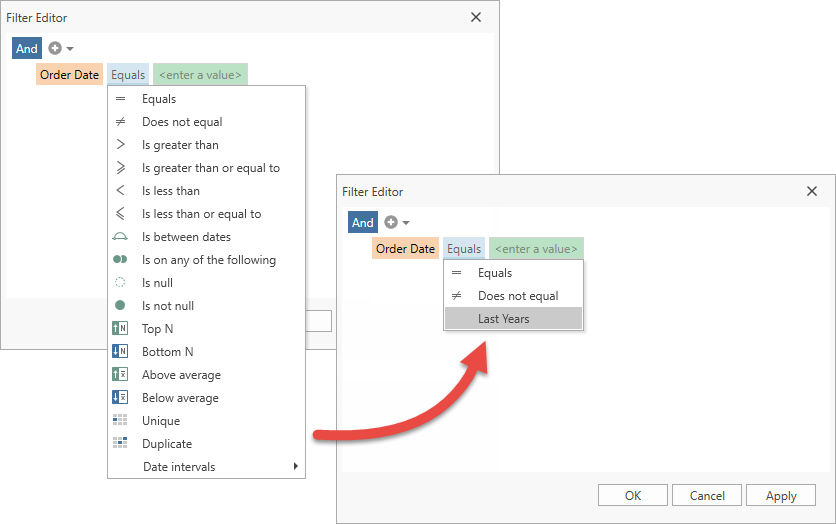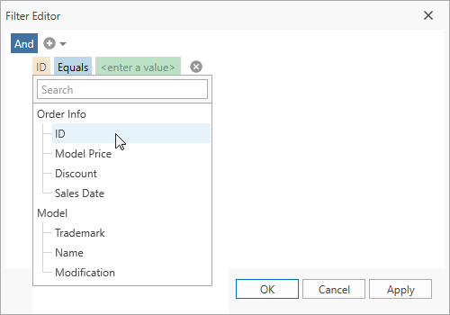 The Filter Editor automatically creates operand editors based on the field and operator type. You can customize operand editors.