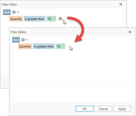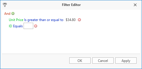 The Filter Editor allows users to build complex filter criteria. A user can add any number of conditions that apply to individual fields and then use logical operators to build the composite filter expression.