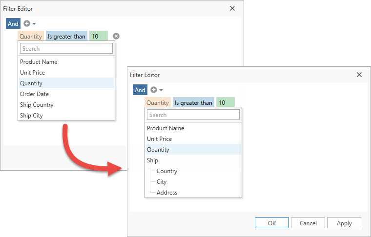 The Filter Editor shows a list of the GridControl‘s fields. If the GridControl displays Bands, the Filter Editor shows fields in a hierarchical structure: