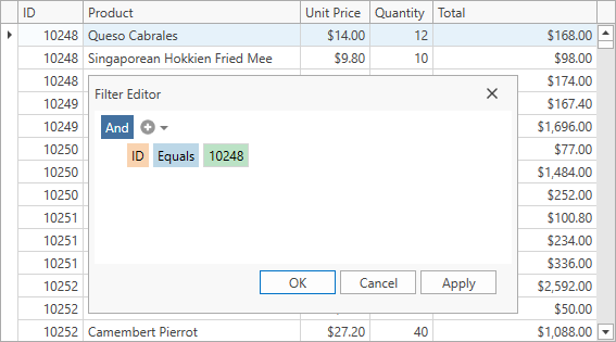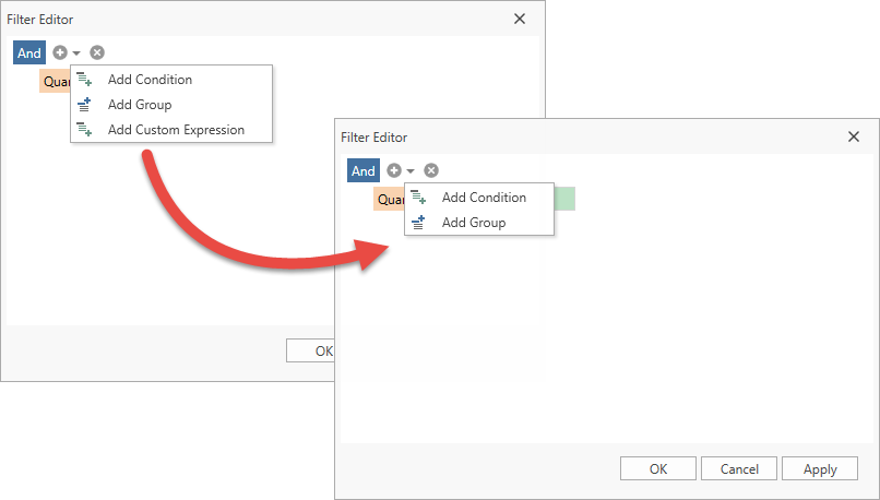 - When users edit filter conditions in the FilterEditorControl (for example, add/remove conditions, select field/operator, specify value), the FilterEditorControl.FilterChanged occurs.