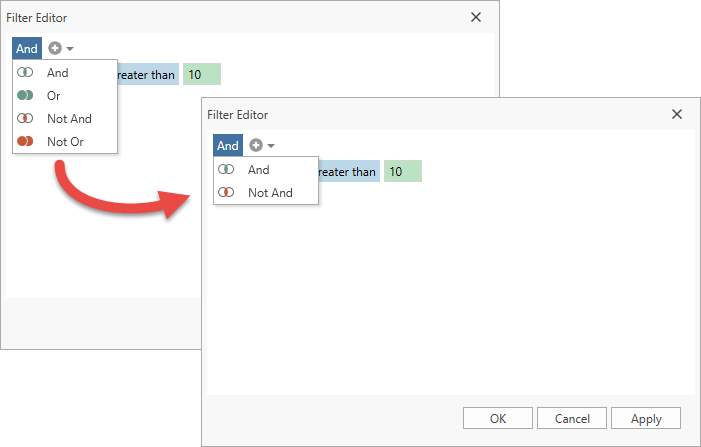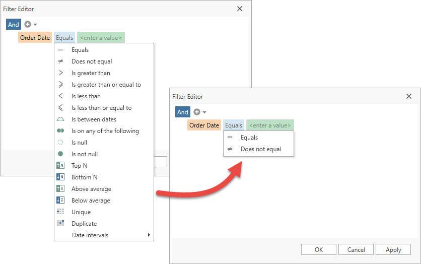 The Filter Editor shows a list of operators the selected field accepts. Use the FilterEditorControl.QueryOperators event to customize the operator list.