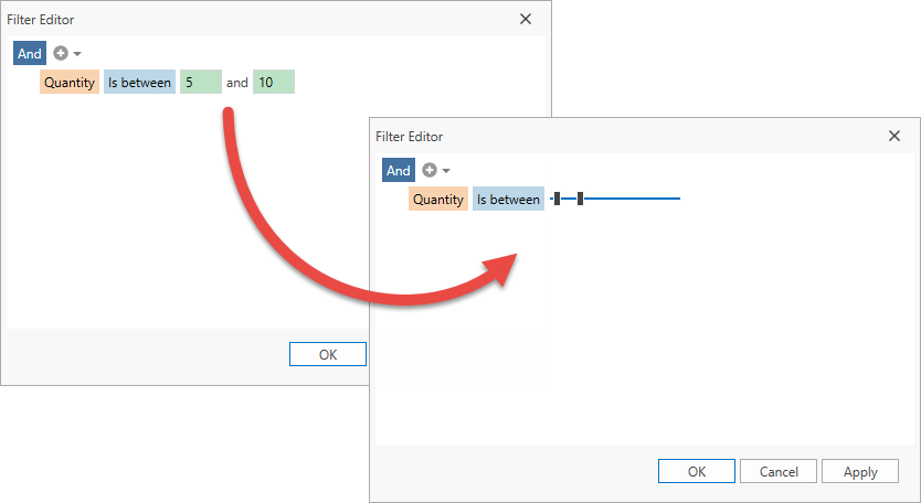 <dxg:TableView x:Name="view"> <dxg:TableView.FilterEditorTemplate> <DataTemplate> <dxfui:FilterEditorControl QueryOperators="OnQueryOperators" /> </DataTemplate> </dxg:TableView.FilterEditorTemplate> </dxg:TableView>void OnQueryOperators(object sender, FilterEditorQueryOperatorsEventArgs e) { if(e.FieldName == "Quantity") { var template = (DataTemplate)FindResource("ternaryTemplate"); e.Operators[FilterEditorOperatorType.Between].OperandTemplate = template; e.Operators[FilterEditorOperatorType.NotBetween].OperandTemplate = template; } }