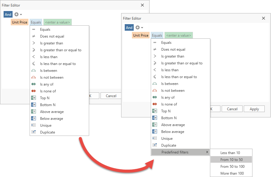 You can specify Predefined Filters with the ColumnBase.PredefinedFilters property. The Filter Editor displays these filters in the Predefined filters submenu: