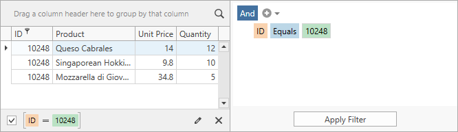 - The FilterEditorControl applies filter criteria to the GridControl‘s context.