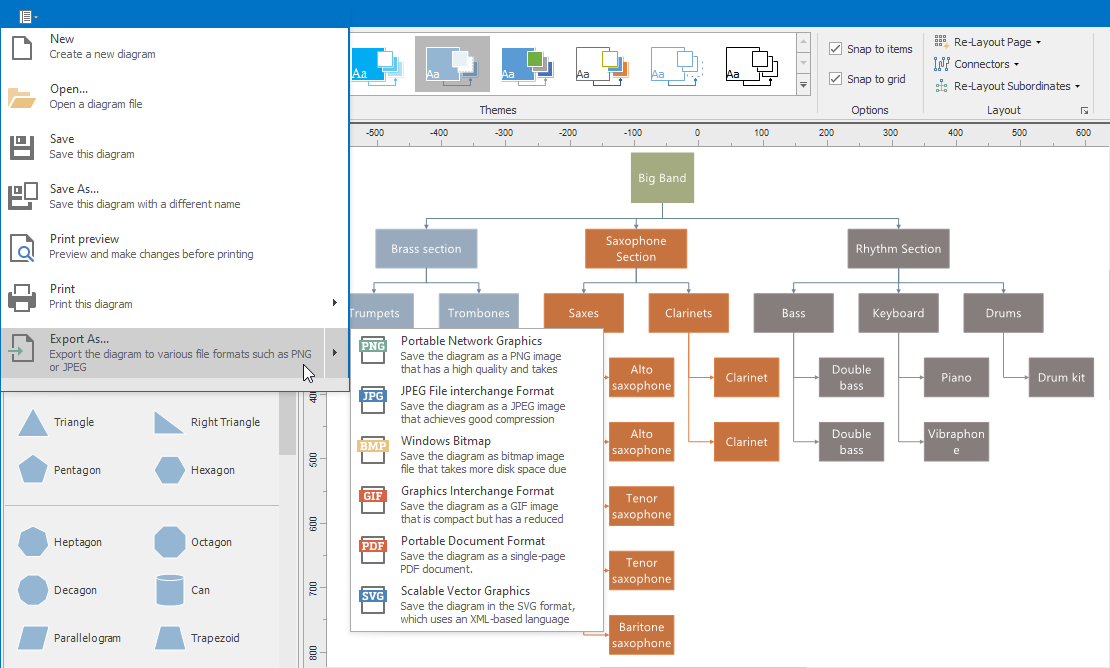 Diagrams can be exported to the following formats: GIF, PNG, BMP, JPG, PDF, SVG.
