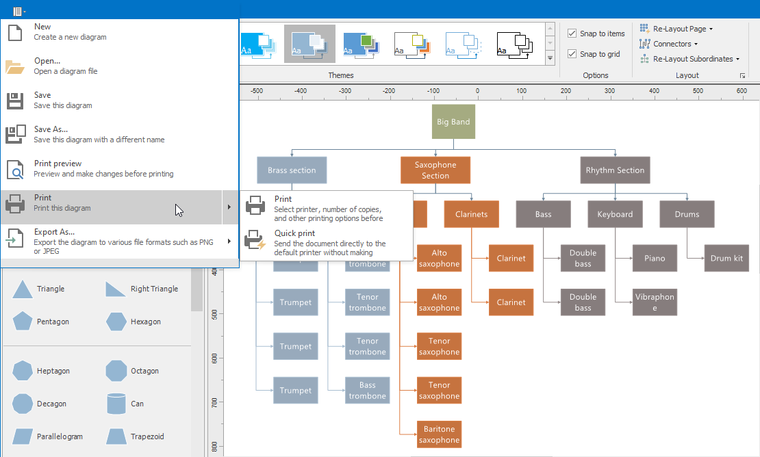 The Quick Print application menu item immediately sends the diagram to the default printer. The corresponding method is DiagramControl.QuickPrint.