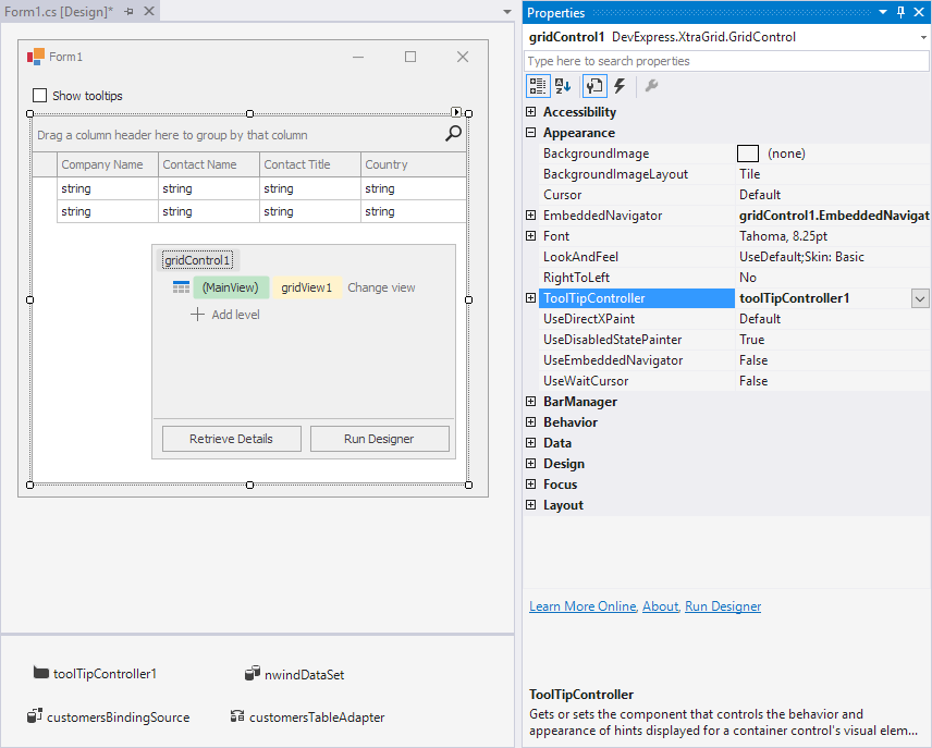 DevExpress controls that support tooltips expose the ToolTipController property. The property specifies the controller that manages tooltips for that particular control. If you assign a custom controller to this property, it is used instead of the default controller. You can assign a single controller to multiple controls — the controller manages tooltips for all these controls. Drop the ToolTipController component from the toolbox onto the component tray and assign it to a control.
