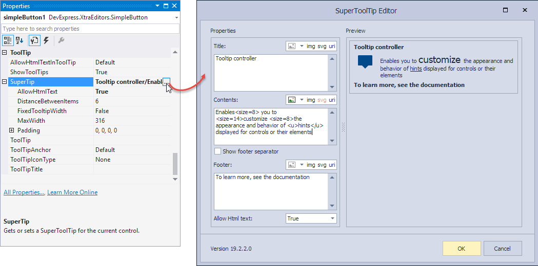 - AllowHtmlText — whether to parse HTML tags in the text. HTML tags allow you to format the text: size, style, hyperlinks, etc. This property overrides the SuperToolTip.AllowHtmlText property.