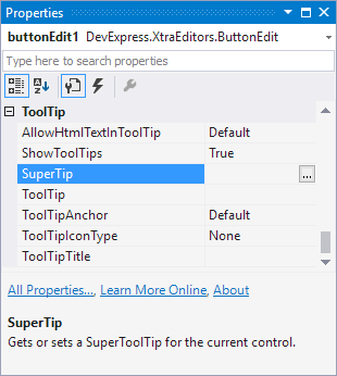 DevExpress controls expose the SuperTip property that allows you to assign a super tooltip to a control. The SuperToolTip Editor allows you to create super tooltips in the designer. To invoke the editor, click a control’s SuperTip ellipsis button in the Properties window.