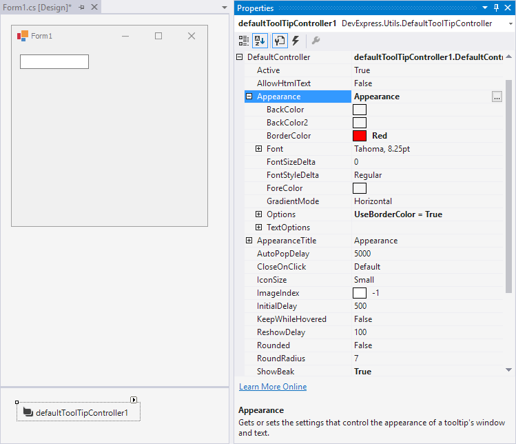 To access the extending properties in the Visual Studio designer, drop the DefaultToolTipController or ToolTipController component onto the component tray. Select a control on the form — the properties are accessible in the Properties window.