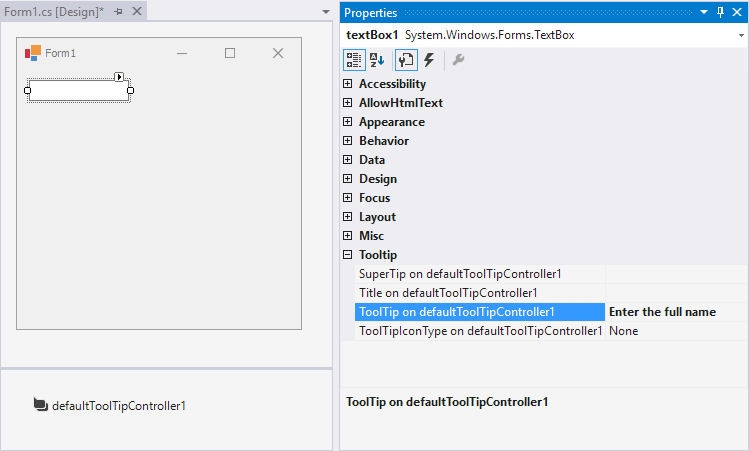 defController.SetToolTip(textBox1, "Enter the full name");