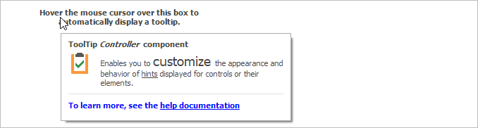 The ToolTipController component manages tooltips in an application. The controller allows you to customize the tooltip behavior and appearance. For example, you can customize the foreground color, position, time interval passed before a tooltip is shown or hidden. The controller also allows you to assign tooltips to standard or third-party controls.