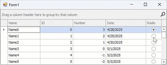 Each data cell has its own in-place editor. Checking a radio item in one cell does not uncheck items in other cells.