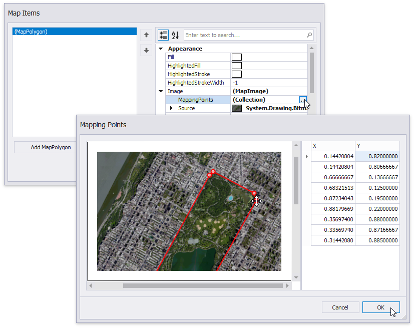 Click the MapImage.MappingPoints property’s ellipsis button to invoke the Mapping Points Editor. Drag points (which mark the map polygon’s vertices) in the image editor on the left to select an image region that should be mapped to the polygon. Click OK to close the Mapping Points editor.