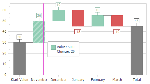 You can format waterfall-related text in the crosshair label and series labels. To do this, use the SeriesBase.CrosshairLabelPattern and SeriesLabelBase.TextPattern properties. The Chart Control provides a {VABS} placeholder that displays an absolute point value. The {V} placeholder shows value changes for rising and falling bars, and the absolute value for the Total bar.