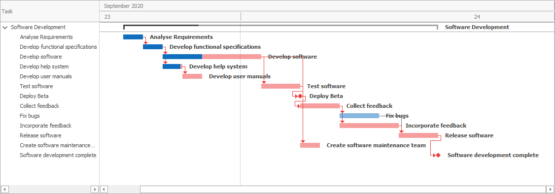 The GanttControl can highlight critical paths — sequences of dependent tasks that affect a project’s start or finish date. Use the CriticalPathHighlightMode option to specify how to highlight critical paths: