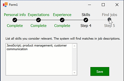 In the following animation, the last StepProgressBar item’s Enabled property is false until the user saves all data: