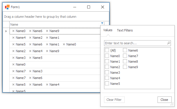 void OnFilterPopupExcelQueryFilterCriteria(object sender, FilterPopupExcelQueryFilterCriteriaEventArgs e) { var viewModel = e.Value as ICollectionValueViewModel<string>; var property = new OperandProperty(e.Path); var functions = viewModel.Values .Select(x => new FunctionOperator(FunctionOperatorType.Contains, property, x)); e.FilterCriteria = CriteriaOperator.Or(functions); }FilterPopupExcelParseFilterCriteria— to convert the applied filter criteria to the corresponding tokens that should be selected in the menu (reverse conversion). This conversion is processed when the user opens the menu.void OnFilterPopupExcelParseFilterCriteria(object sender, FilterPopupExcelParseFilterCriteriaEventArgs e) { var func = e.FilterCriteria as FunctionOperator; if(!ReferenceEquals(func, null)) e.SetValue(((OperandValue)func.Operands[1]).Value); var group = e.FilterCriteria as GroupOperator; if(!ReferenceEquals(group, null)) { var values = group.Operands .OfType<FunctionOperator>() .Select(x => ((OperandValue)x.Operands[1]).Value); e.SetValues(values.ToArray()); } }