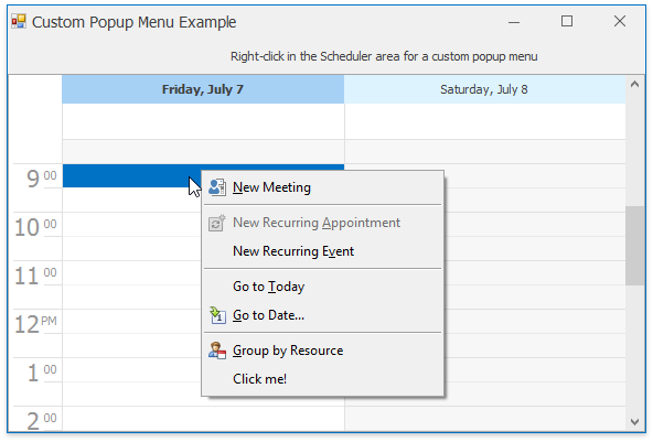 This example handles the PopupMenuShowing event to customize the Scheduler’s popup menu (add, modify, and remove existing items):