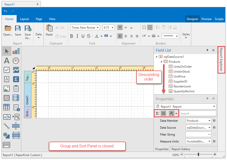 Hide and Customize Dock Panels in the Report Designer