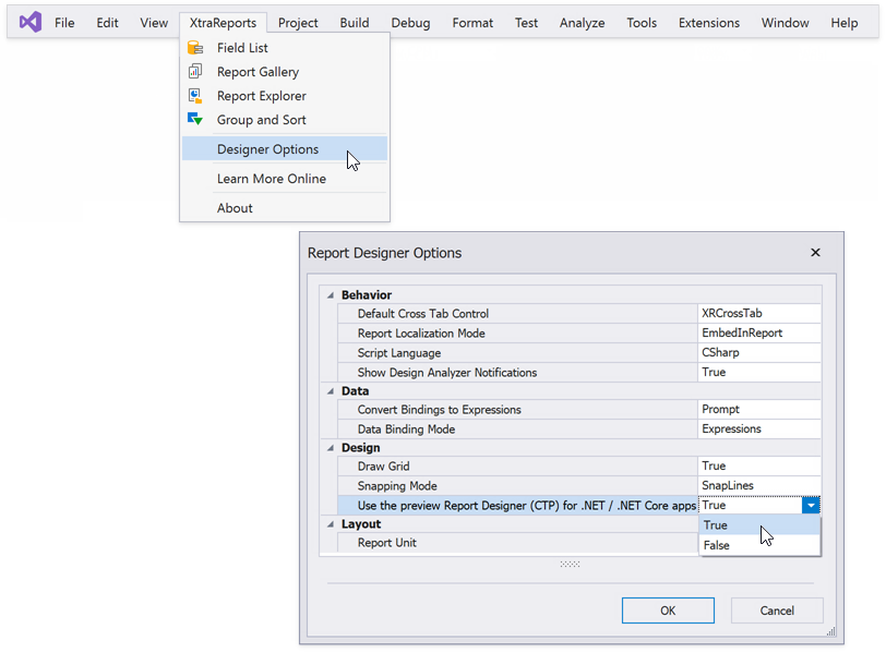 Expand Visual Studio’s XtraReports menu and click the Designer Options item to invoke the Report Designer Options dialog. Enable the Use the preview Report Designer (CTP) for .NET /.NET Core apps property in the Design category.