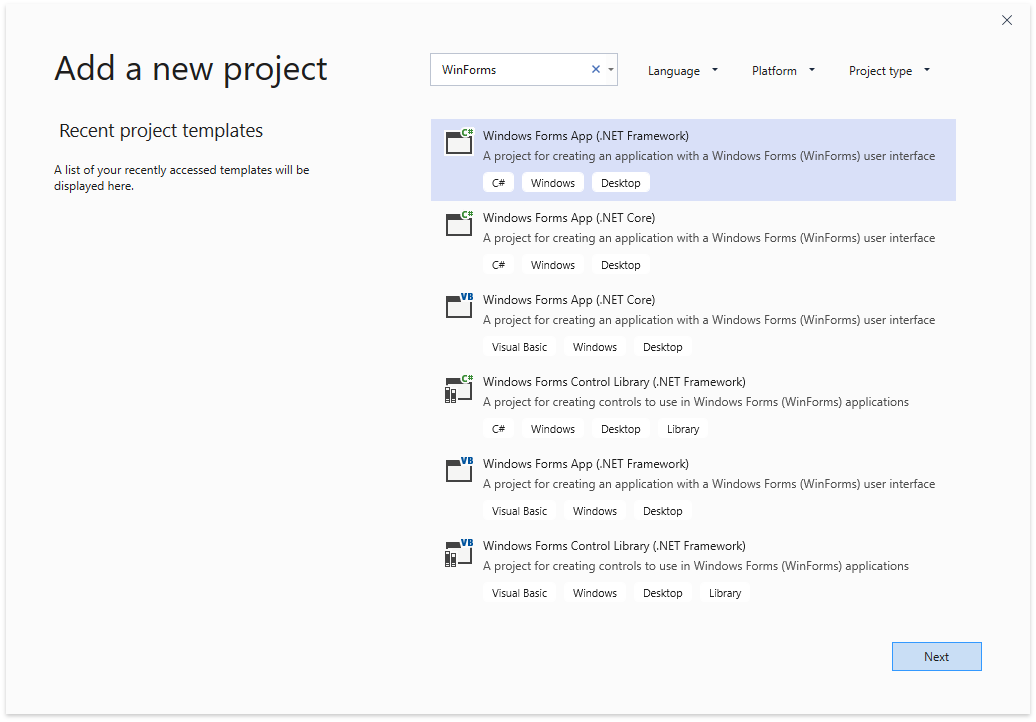 - Use the dotnet new winforms command to create a WinForms project.
