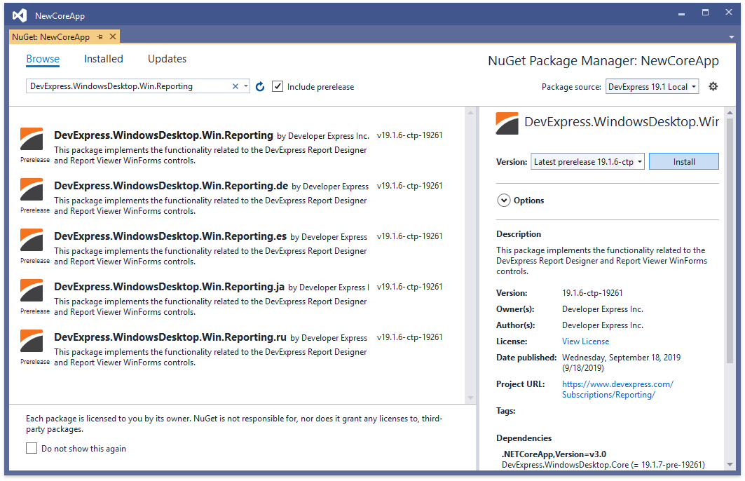 Select DevExpress 19.1 Local in the Package source drop-down list and go to the Browse page. Find the DevExpress.WindowsDesktop.Win.Reporting/DevExpress.WindowsDesktop.Wpf.Reporting package and install it.
