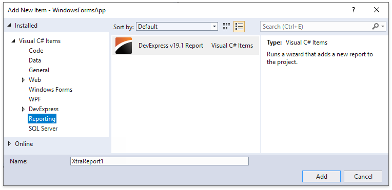 In the invoked Add New Item dialog, switch to the Reporting directory, select the DevExpress v19.1 Report item, specify the report name, and click Add.