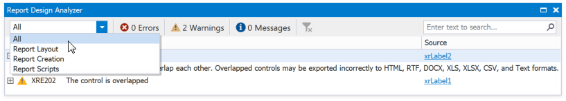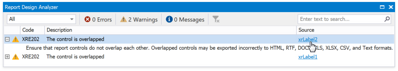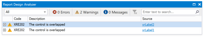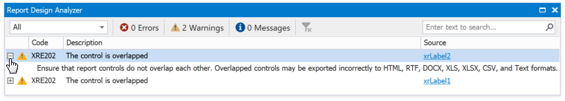 Layout-related messages (for instance, in cases when report controls overlap each other or extend beyond the report’s printable area).
