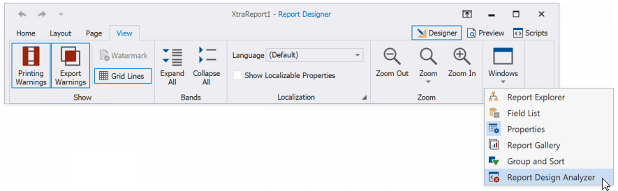 Select Report Design Analyzer from the Windows drop-down menu in the View toolbar tab.