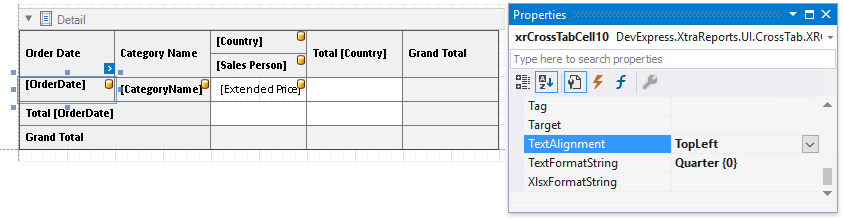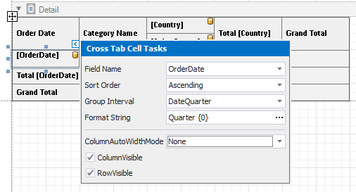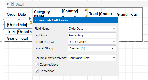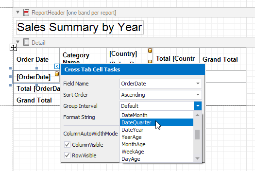 Select the Cross Tab cell bound to the OrderDate field and click its smart tag. Set the GroupInterval property to DateQuarter to group the original data by quarters.