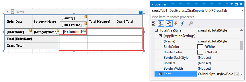 Expand the TotalAreaStyle property and set the Font to Calibri, 9pt, style=Bold.