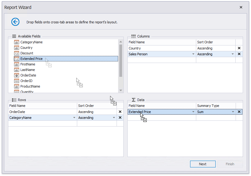 Note that the field order defines the hierarchy in the resulting cross-tab report. The higher the field on the list, the higher the level in the field hierarchy.