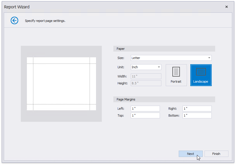Change the report page layout to landscape to ensure the cross-tab content fits the report well. Click Next.