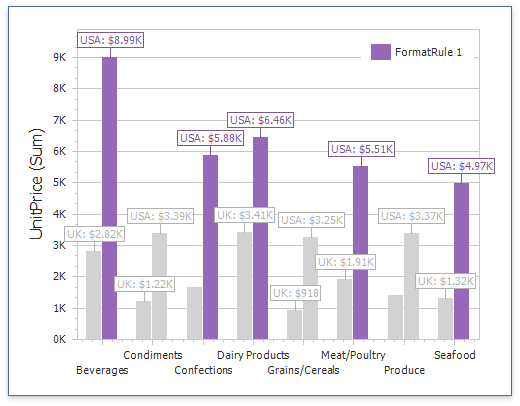 Enable Display in Legend to add information about the applied rule to the chart. Set the Caption field to specify the legend’s text. For Range format rules, the legend’s text is generated automatically and depends on the range intervals.