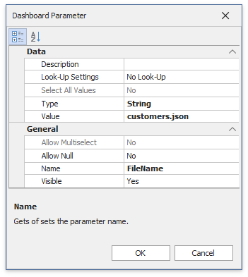 Select Add Dashboard Parameter from the Value property’s drop-down list, configure the dashboard parameter in the invoked Dashboard Parameter dialog, and click OK.