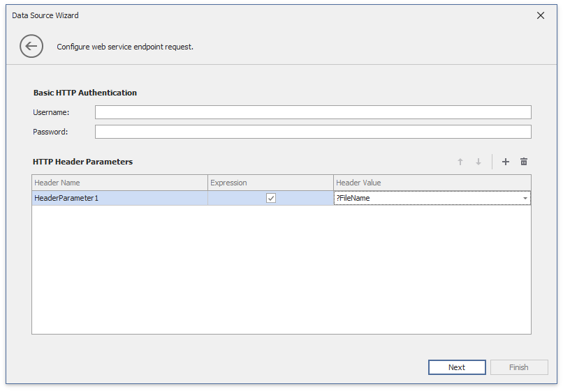 Click Next to configure basic HTTP authentication credentials and specify HTTP Header parameters.