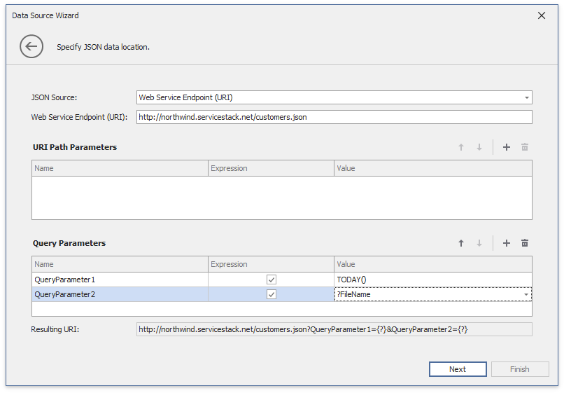 You can use expressions and dashboard parameters to set path parameters, query parameter values and headers. Click the “+” icon to create a new parameter, enable the new parameter’s Expression property and select Expression Editor from the Value property’s drop-down list.