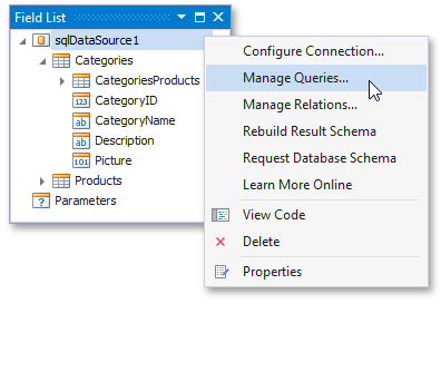 The newly created SQL data source will be displayed in the Data Sources node of the Report Explorer. Additionally, the hierarchy of the data source will be reflected by the Field List. In both panels, you can right-click the data source to access its settings.