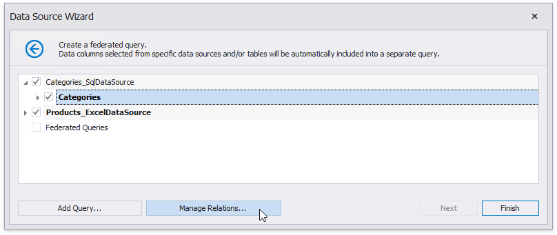 On the next page, enable check boxes for the SQL data source’s table and the Excel data source. The selected items are included in data federation as separate queries.